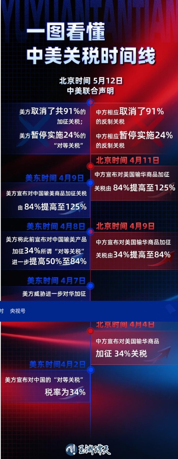 当地时间5月12日,中美日内瓦经贸会谈联合声明发布,双方大幅降低双边关税水平,这一举措符合两国生产者和消费者的期待,也符合两国利益和世界共同利益。关税是如何变化的,一图看懂。